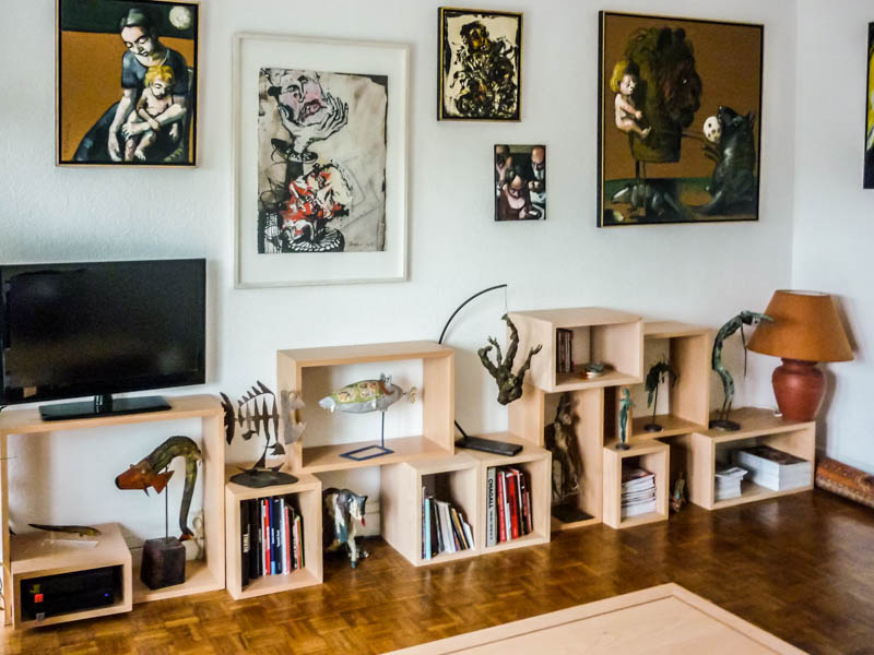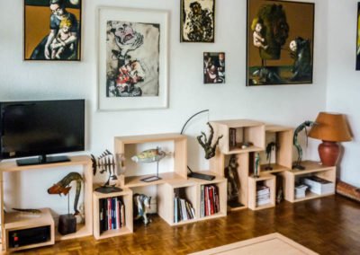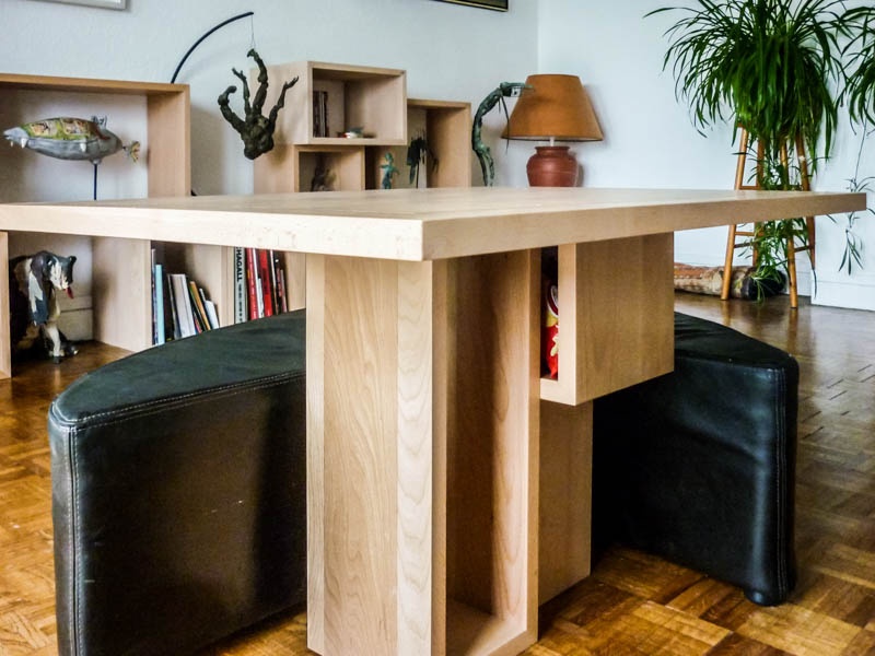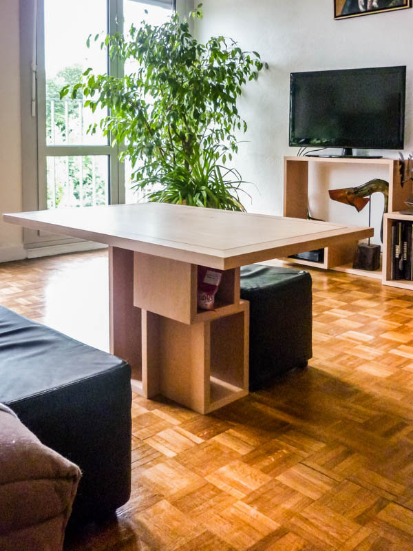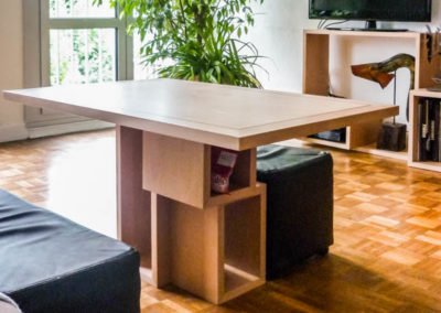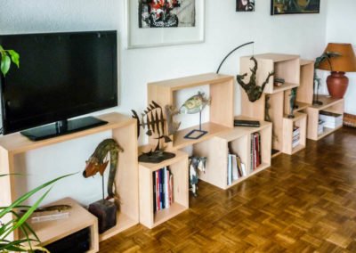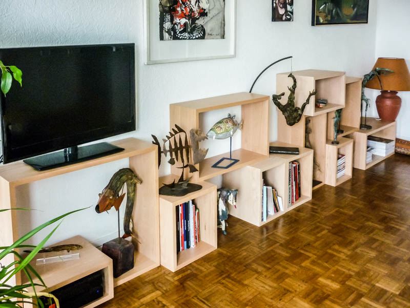 Grâce à ce système de cubes en bois, nous avons pu créer un meuble qui s’intègre s’adapte parfaitement aux dimensions du séjour mais qui pourra également être remanié pour faire une bibliothèque ou encore pour aller dans une autre pièce.