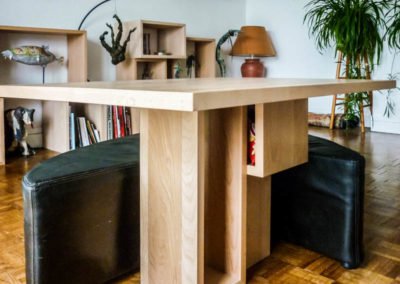 Le tout a été fabriqué avec des matériaux de qualité supérieure, en bois massif pour garantir une solidité à toute épreuve. Nous avons pris en compte les contraintes de l’espace et les envies du client pour les intégrer dans la conception du meuble.